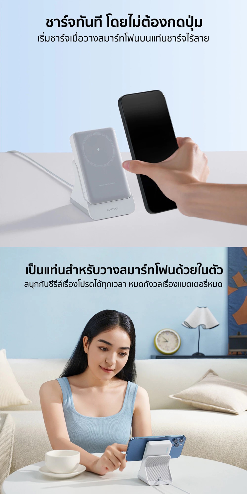 - วางบนแท่นแล้วใช้งานเป็น แท่นชาร์จไร้สาย บนโต๊ะได้ทันที