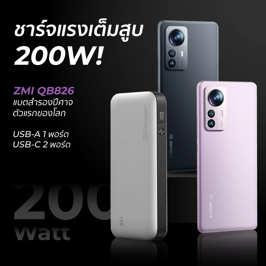 ภายในกล่องมีอะแดปเตอร์ชาร์จไว 120W มาให้แล้วแต่แบตเตอรี่สำรองที่รองรับชาร์จไว 120W ทางเรา ZMI จัดมาให้แล้วกับ ZMI QB826 ต้องบอกเลยว่าเป็นแบตสำรองปีศาจตัวแรกของโลก ที่ปล่อยไฟชาร์จแรงเต็มสูบรวม 200W พร้อมเทคโนโลยีเต็มเปี่ยม Super Fast Charger / PD3.0 / Mi Turbo Charge / QC4+