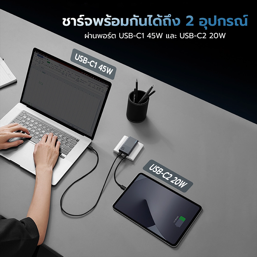 * เมื่อชาร์จพร้อมกันจะจ่ายไฟ USB-C1 45W / USB-C2 20W