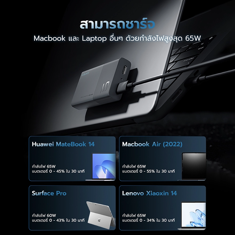 * MacBook Air กำลังไฟ 65W ชาร์จ 0-55% ใน 30 นาที