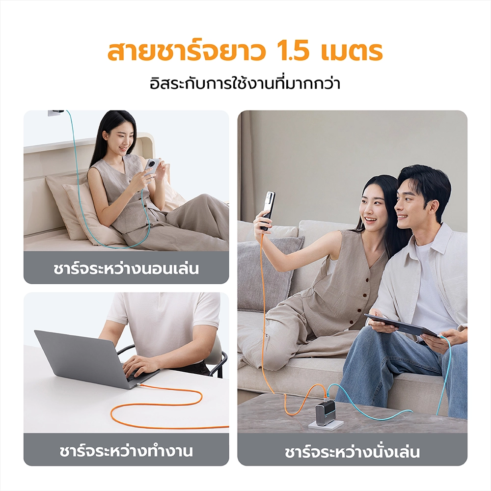 - สายชาร์จมีความยาว 1.5 เมตร ให้อิสระในการใช้งานที่มากกว่า