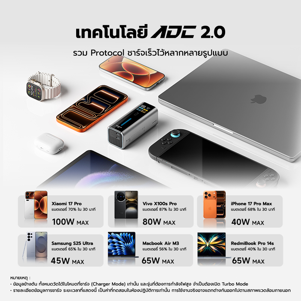 - เทคโนโลยี ADC 2.0 รวม Protocol ชาร์จเร็วไว้หลากหลายเทคโนโลยี