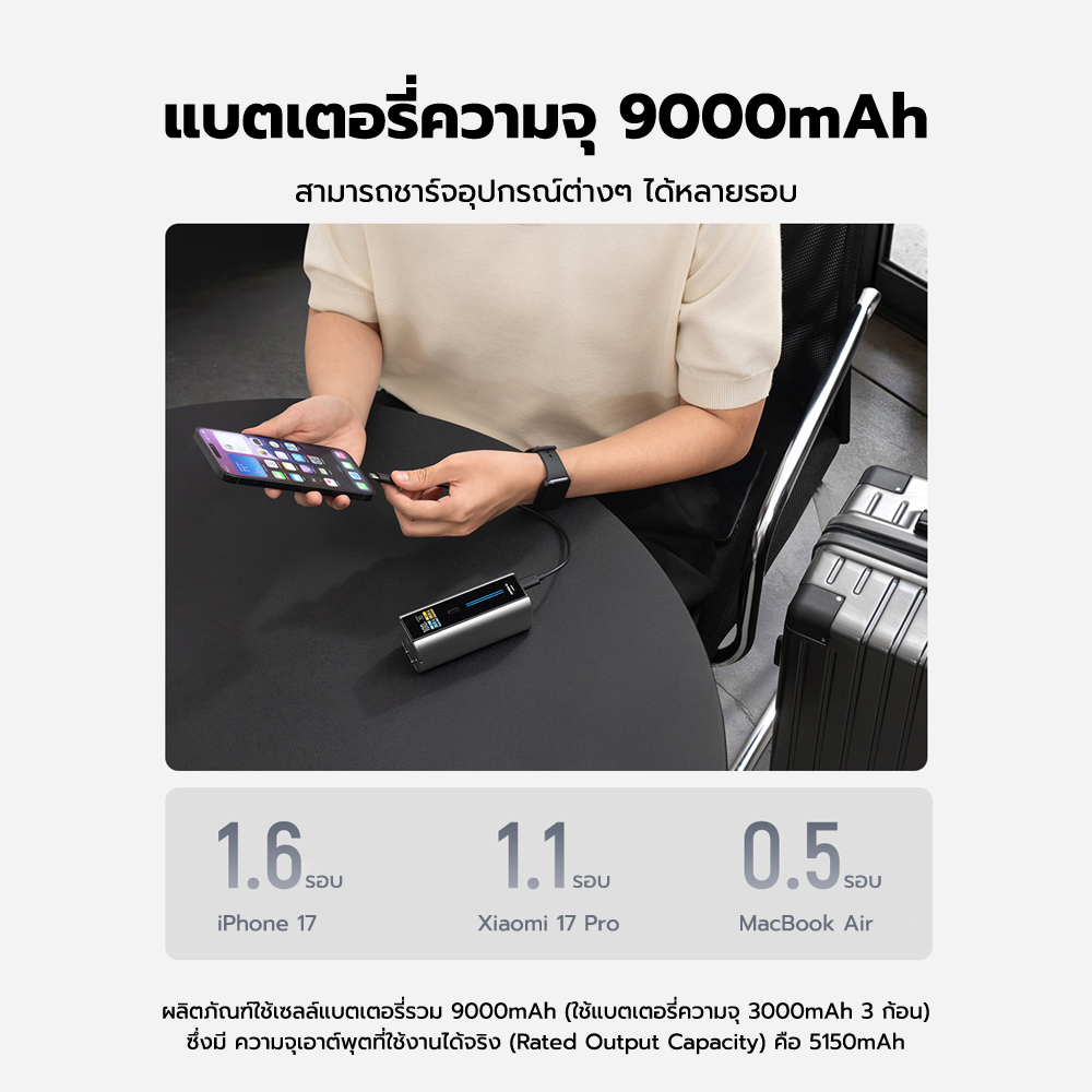 - แบตเตอรี่ความจุ 9000mAh สามารถชาร์จอุปกรณ์ต่างๆ ได้หลายรอบ