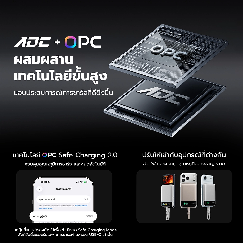 - OPC Safe Charging 2.0 ควบคุมอุณหภูมิการชาร์จ และหยุดอัตโนมัติ