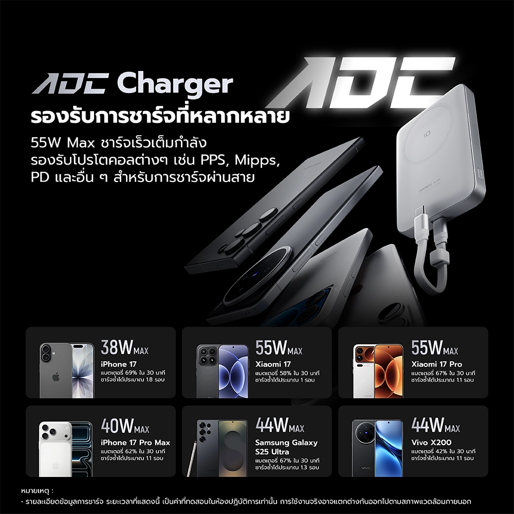- ADC Charger รองรับการชาร์จที่หลากหลาย กำลังไฟสูงสุด 55W Max