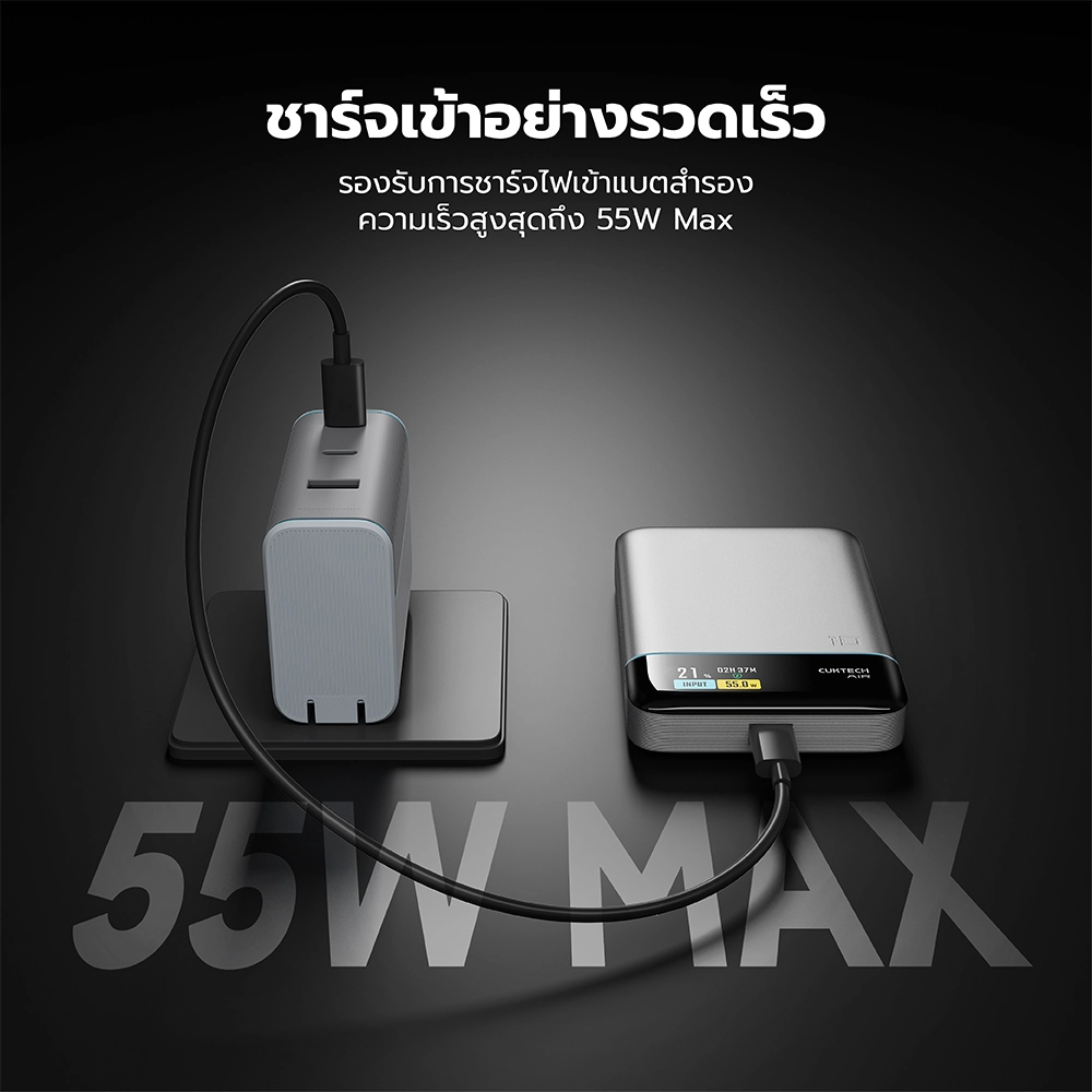 - ชาร์จเข้าอย่างรวดเร็ว ด้วยการชาร์จเข้าแบตสำรองสูงสุดถึง 55W Max