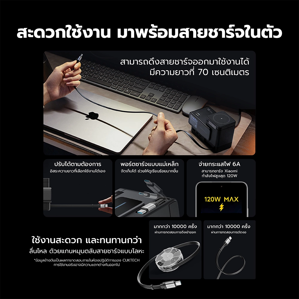 - สายชาร์จ USB-C ในตัวความยาว 70 เซนติเมตร รับกำลังไฟได้ถึง 6A 120W
