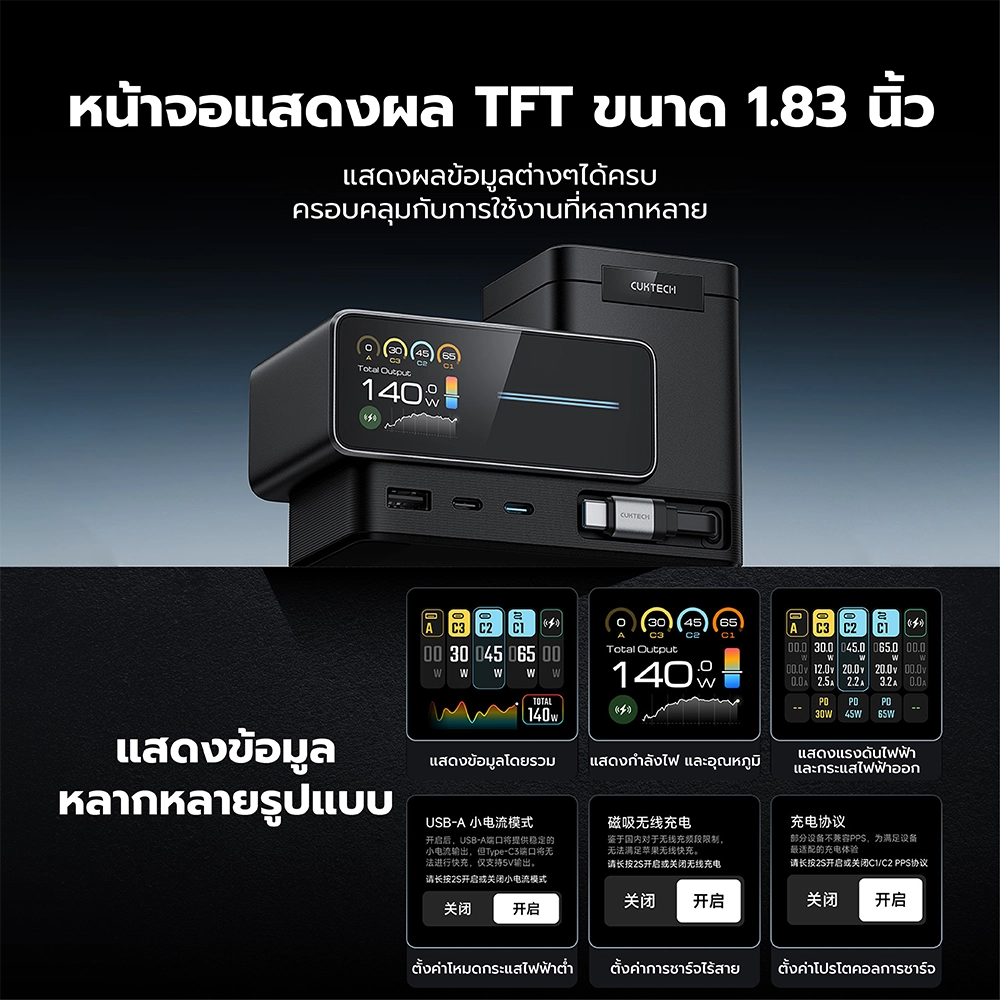 - จอแสดงผล TFT ขนาด 1.83 นิ้ว แสดงผลข้อมูลต่างๆได้ครบทุกพอร์ตที่ชาร์จ