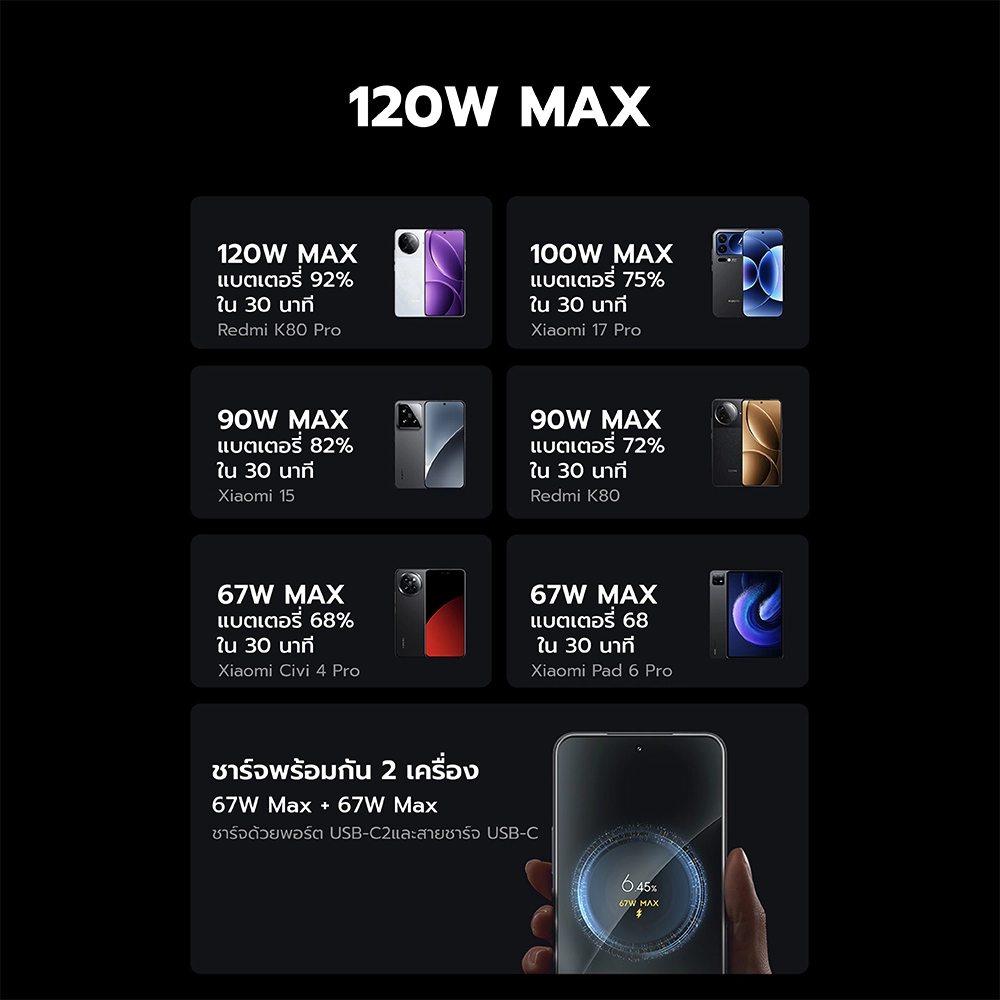 - รองรับการชาร์จ Xiaomi ด้วยเทคโนโลยี MiPPS ด้วยกำลังไฟสูงสุด 120W